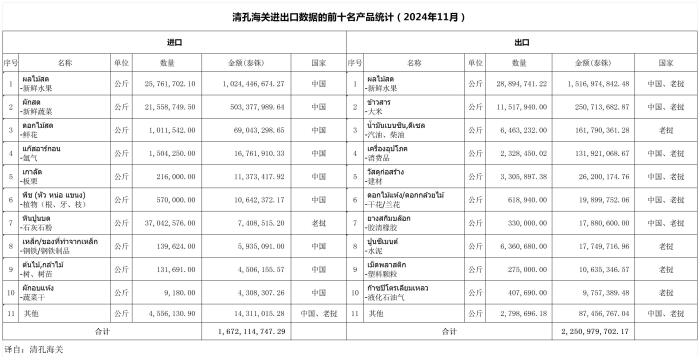 清孔海关进出口数据的前十名产品统计(2024年11月)